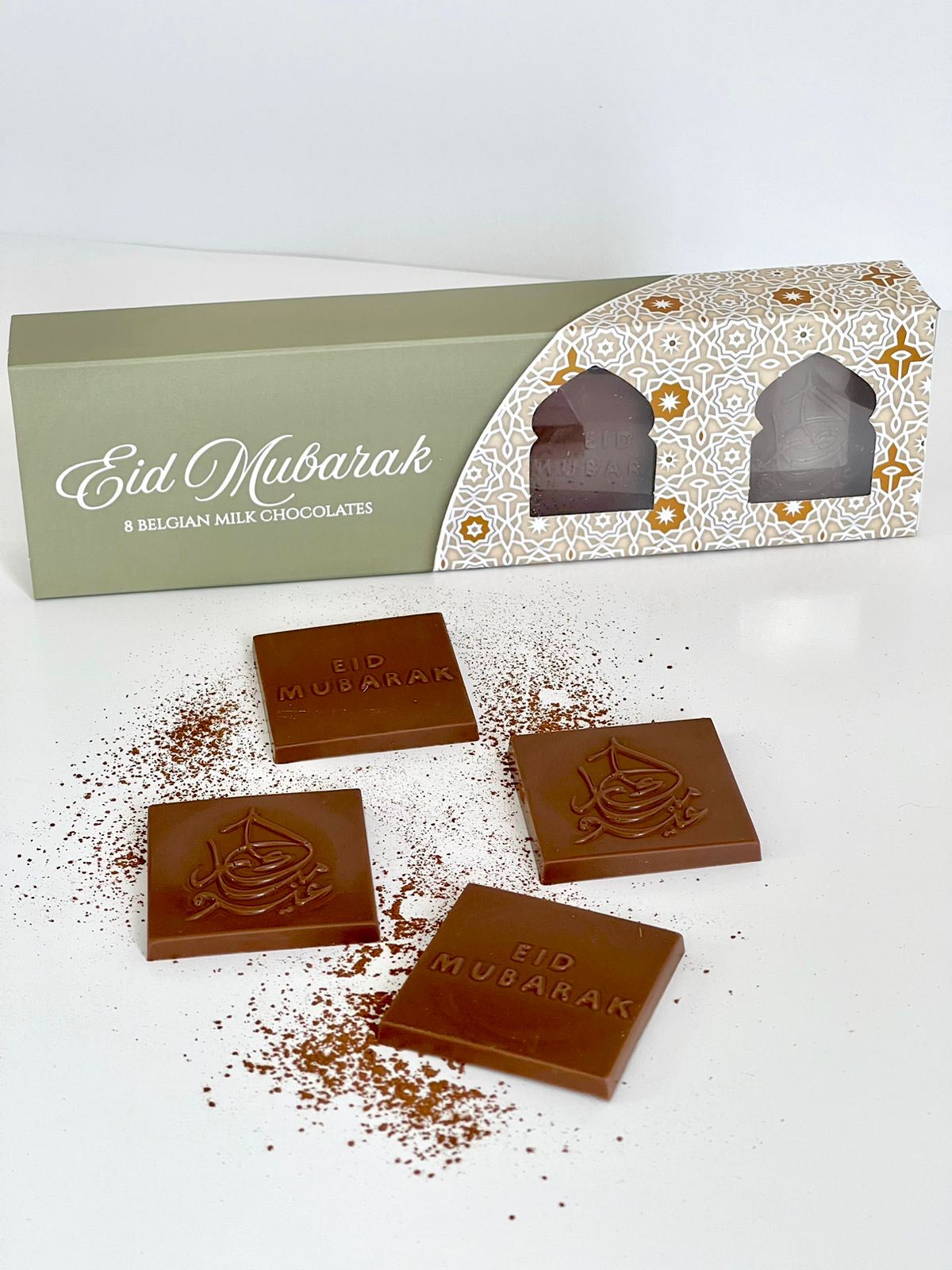 Gift your loved ones the most unique chocolate box this Eid-ul-Fitr | 8 Belgian milk chocolates | unique Arabic typography with a minimal English text to complement it, debossed onto a Belgian chocolate square, packaged in a premium slide out box with the most beautiful arabesque design with 2 windows.